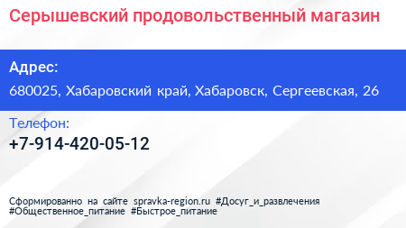 Серышевский, продовольственный магазин по адресу 680025, Хабаровский край, Хабаровск, Сергеевская, 26 в дальнейшем Организация, размещена в следующих категориях: