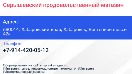 Серышевский, продовольственный магазин по адресу 680014, Хабаровский край, Хабаровск, Восточное шоссе, 42а в дальнейшем Организация, размещена в следующих категориях: