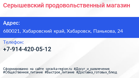 Серышевский, продовольственный магазин по адресу 680021, Хабаровский край, Хабаровск, Панькова, 24 в дальнейшем Организация, размещена в следующих категориях: