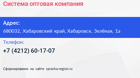 Система, оптовая компания по адресу 680032, Хабаровский край, Хабаровск, Зелёная, 1а в дальнейшем Организация, размещена в следующих категориях: