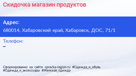 Скидочка, магазин продуктов по адресу 680014, Хабаровский край, Хабаровск, ДОС, 71/1 в дальнейшем Организация, размещена в следующих категориях:
