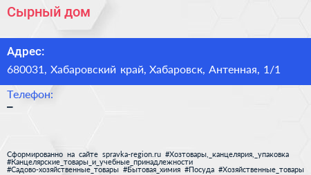 Сырный дом по адресу 680031, Хабаровский край, Хабаровск, Антенная, 1/1 в дальнейшем Организация, размещена в следующих категориях:
