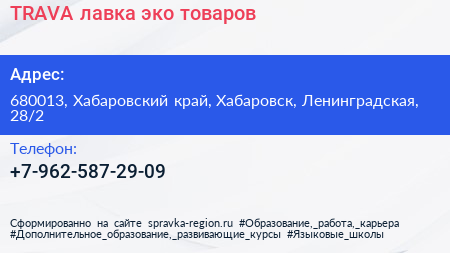 TRAVA, лавка эко-товаров по адресу 680013, Хабаровский край, Хабаровск, Ленинградская, 28/2 в дальнейшем Организация, размещена в следующих категориях:
