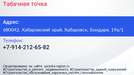 Табачная точка по адресу 680042, Хабаровский край, Хабаровск, Бондаря, 19а/1 в дальнейшем Организация, размещена в следующих категориях: