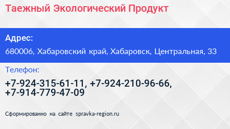 Таежный Экологический Продукт по адресу 680006, Хабаровский край, Хабаровск, Центральная, 33 в дальнейшем Организация, размещена в следующих категориях: