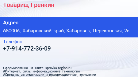 Товарищ Гренкин по адресу 680006, Хабаровский край, Хабаровск, Перекопская, 2в в дальнейшем Организация, размещена в следующих категориях:
