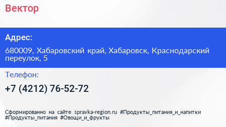 Вектор по адресу 680009, Хабаровский край, Хабаровск, Краснодарский переулок, 5 в дальнейшем Организация, размещена в следующих категориях: