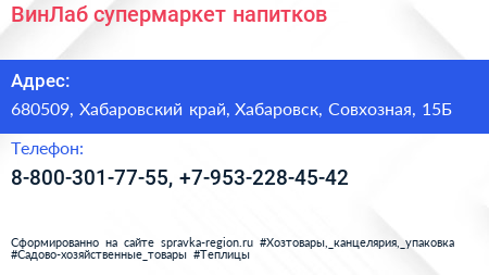 ВинЛаб, супермаркет напитков по адресу 680509, Хабаровский край, Хабаровск, Совхозная, 15Б в дальнейшем Организация, размещена в следующих категориях: