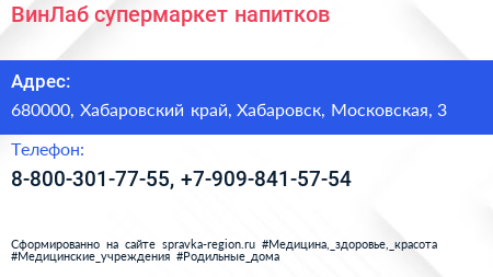 ВинЛаб, супермаркет напитков по адресу 680000, Хабаровский край, Хабаровск, Московская, 3 в дальнейшем Организация, размещена в следующих категориях: