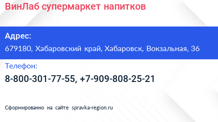 ВинЛаб, супермаркет напитков по адресу 679180, Хабаровский край, Хабаровск, Вокзальная, 36 в дальнейшем Организация, размещена в следующих категориях: