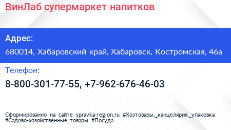ВинЛаб, супермаркет напитков по адресу 680014, Хабаровский край, Хабаровск, Костромская, 46а в дальнейшем Организация, размещена в следующих категориях: