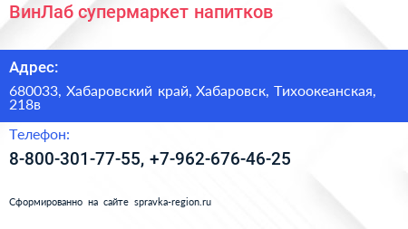 ВинЛаб, супермаркет напитков по адресу 680033, Хабаровский край, Хабаровск, Тихоокеанская, 218в в дальнейшем Организация, размещена в следующих категориях: