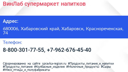 ВинЛаб, супермаркет напитков по адресу 680006, Хабаровский край, Хабаровск, Краснореченская, 74 в дальнейшем Организация, размещена в следующих категориях: