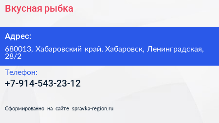 Вкусная рыбка по адресу 680013, Хабаровский край, Хабаровск, Ленинградская, 28/2 в дальнейшем Организация, размещена в следующих категориях:
