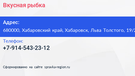 Вкусная рыбка по адресу 680000, Хабаровский край, Хабаровск, Льва Толстого, 19/2 в дальнейшем Организация, размещена в следующих категориях: