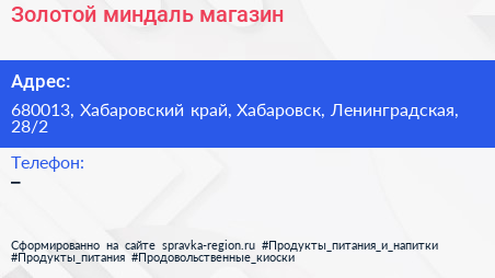 Золотой миндаль, магазин по адресу 680013, Хабаровский край, Хабаровск, Ленинградская, 28/2 в дальнейшем Организация, размещена в следующих категориях: