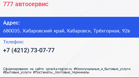777, автосервис по адресу 680035, Хабаровский край, Хабаровск, Трёхгорная, 92в в дальнейшем Организация, размещена в следующих категориях: