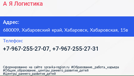 А-Я Логистика по адресу 680009, Хабаровский край, Хабаровск, Хабаровская, 15в в дальнейшем Организация, размещена в следующих категориях: