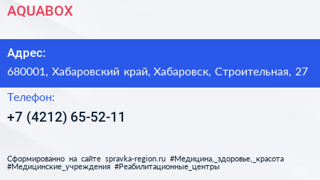 AQUABOX по адресу 680001, Хабаровский край, Хабаровск, Строительная, 27 в дальнейшем Организация, размещена в следующих категориях: