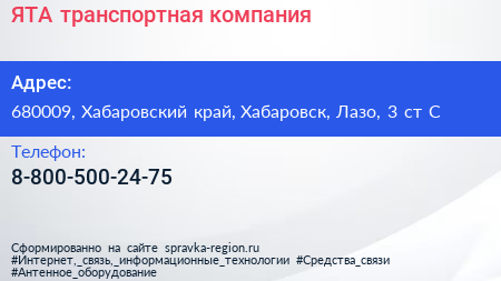 ЯТА, транспортная компания по адресу 680009, Хабаровский край, Хабаровск, Лазо, 3 ст С в дальнейшем Организация, размещена в следующих категориях: