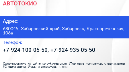 АВТОТОКИО по адресу 680045, Хабаровский край, Хабаровск, Краснореченская, 106а в дальнейшем Организация, размещена в следующих категориях: