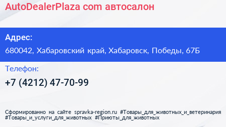 AutoDealerPlaza.com, автосалон по адресу 680042, Хабаровский край, Хабаровск, Победы, 67Б в дальнейшем Организация, размещена в следующих категориях: