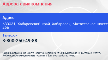 Аврора, авиакомпания по адресу 680031, Хабаровский край, Хабаровск, Матвеевское шоссе, 26Б в дальнейшем Организация, размещена в следующих категориях: