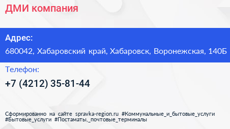 ДМИ, компания по адресу 680042, Хабаровский край, Хабаровск, Воронежская, 140Б в дальнейшем Организация, размещена в следующих категориях:
