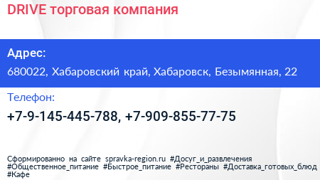 DRIVE, торговая компания по адресу 680022, Хабаровский край, Хабаровск, Безымянная, 22 в дальнейшем Организация, размещена в следующих категориях: