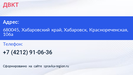ДВКТ по адресу 680045, Хабаровский край, Хабаровск, Краснореченская, 106а в дальнейшем Организация, размещена в следующих категориях: