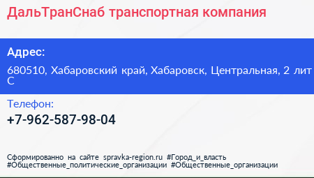 ДальТранСнаб, транспортная компания по адресу 680510, Хабаровский край, Хабаровск, Центральная, 2 лит С в дальнейшем Организация, размещена в следующих категориях: