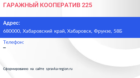 ГАРАЖНЫЙ КООПЕРАТИВ №225 по адресу 680000, Хабаровский край, Хабаровск, Фрунзе, 58Б в дальнейшем Организация, размещена в следующих категориях: