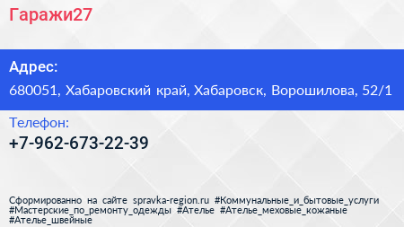 Гаражи27 по адресу 680051, Хабаровский край, Хабаровск, Ворошилова, 52/1 в дальнейшем Организация, размещена в следующих категориях: