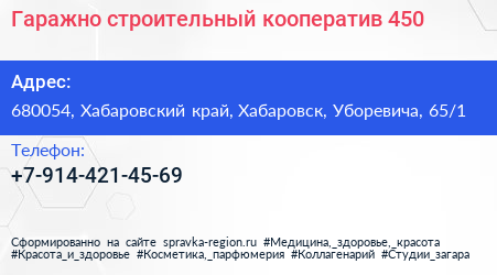Гаражно-строительный кооператив №450 по адресу 680054, Хабаровский край, Хабаровск, Уборевича, 65/1 в дальнейшем Организация, размещена в следующих категориях: