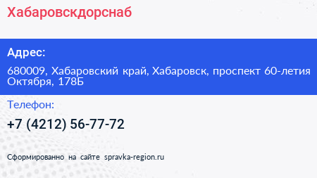 Хабаровскдорснаб по адресу 680009, Хабаровский край, Хабаровск, проспект 60-летия Октября, 178Б в дальнейшем Организация, размещена в следующих категориях: