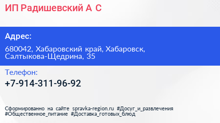 ИП Радишевский А.С. по адресу 680042, Хабаровский край, Хабаровск, Салтыкова-Щедрина, 35 в дальнейшем Организация, размещена в следующих категориях: