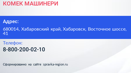 КОМЕК МАШИНЕРИ по адресу 680014, Хабаровский край, Хабаровск, Восточное шоссе, 41 в дальнейшем Организация, размещена в следующих категориях: