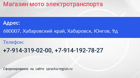 Магазин мото-электротранспорта по адресу 680007, Хабаровский край, Хабаровск, Юнгов, 9д в дальнейшем Организация, размещена в следующих категориях: