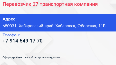 Перевозчик 27, транспортная компания по адресу 680031, Хабаровский край, Хабаровск, Оборская, 11Б в дальнейшем Организация, размещена в следующих категориях: