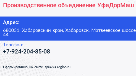 Производственное объединение УфаДорМаш по адресу 680031, Хабаровский край, Хабаровск, Матвеевское шоссе, 44 в дальнейшем Организация, размещена в следующих категориях: