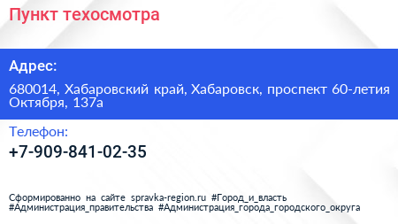 Пункт техосмотра по адресу 680014, Хабаровский край, Хабаровск, проспект 60-летия Октября, 137а в дальнейшем Организация, размещена в следующих категориях: