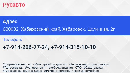 Русавто по адресу 680032, Хабаровский край, Хабаровск, Целинная, 2г в дальнейшем Организация, размещена в следующих категориях:
