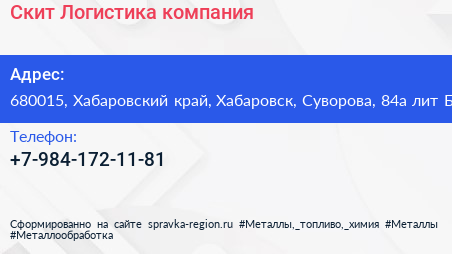 Скит Логистика, компания по адресу 680015, Хабаровский край, Хабаровск, Суворова, 84а лит Б в дальнейшем Организация, размещена в следующих категориях: