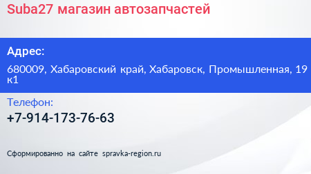 Suba27, магазин автозапчастей по адресу 680009, Хабаровский край, Хабаровск, Промышленная, 19 к1 в дальнейшем Организация, размещена в следующих категориях: