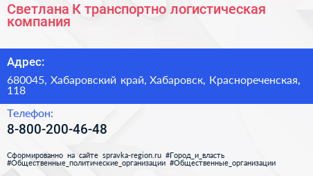Светлана-К, транспортно-логистическая компания по адресу 680045, Хабаровский край, Хабаровск, Краснореченская, 118 в дальнейшем Организация, размещена в следующих категориях: