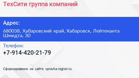 ТехСити, группа компаний по адресу 680038, Хабаровский край, Хабаровск, Лейтенанта Шмидта, 30 в дальнейшем Организация, размещена в следующих категориях: