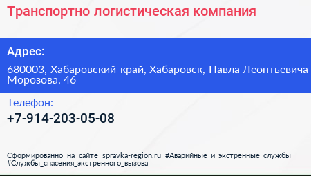 Транспортно-логистическая компания по адресу 680003, Хабаровский край, Хабаровск, Павла Леонтьевича Морозова, 46 в дальнейшем Организация, размещена в следующих категориях: