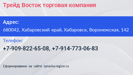 Трейд-Восток, торговая компания по адресу 680042, Хабаровский край, Хабаровск, Воронежская, 142 в дальнейшем Организация, размещена в следующих категориях: