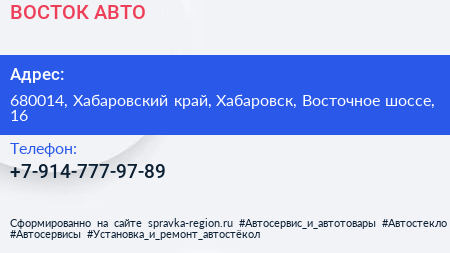 ВОСТОК-АВТО по адресу 680014, Хабаровский край, Хабаровск, Восточное шоссе, 16 в дальнейшем Организация, размещена в следующих категориях:
