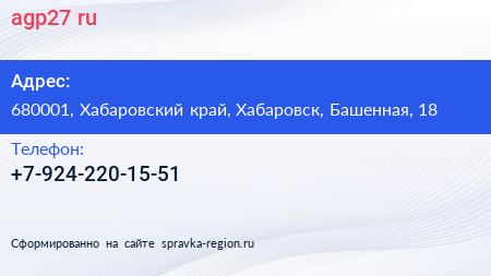 agp27.ru по адресу 680001, Хабаровский край, Хабаровск, Башенная, 18 в дальнейшем Организация, размещена в следующих категориях: